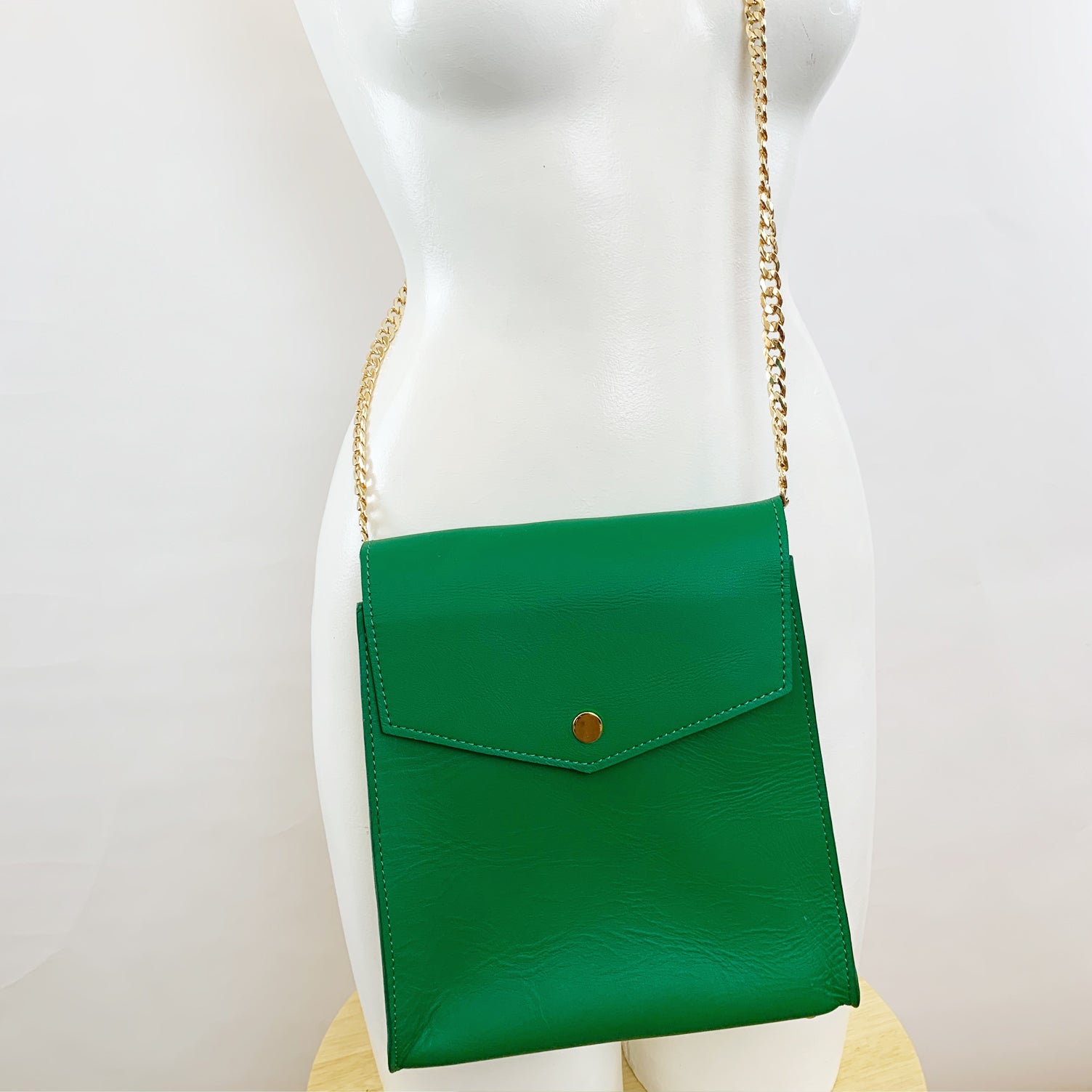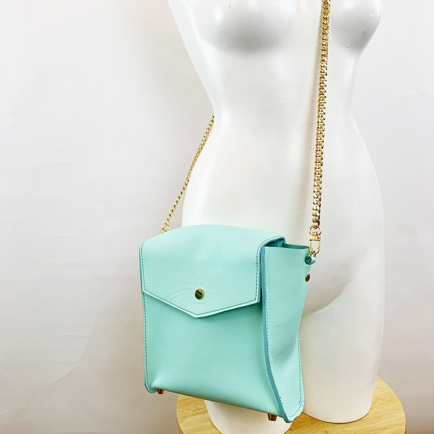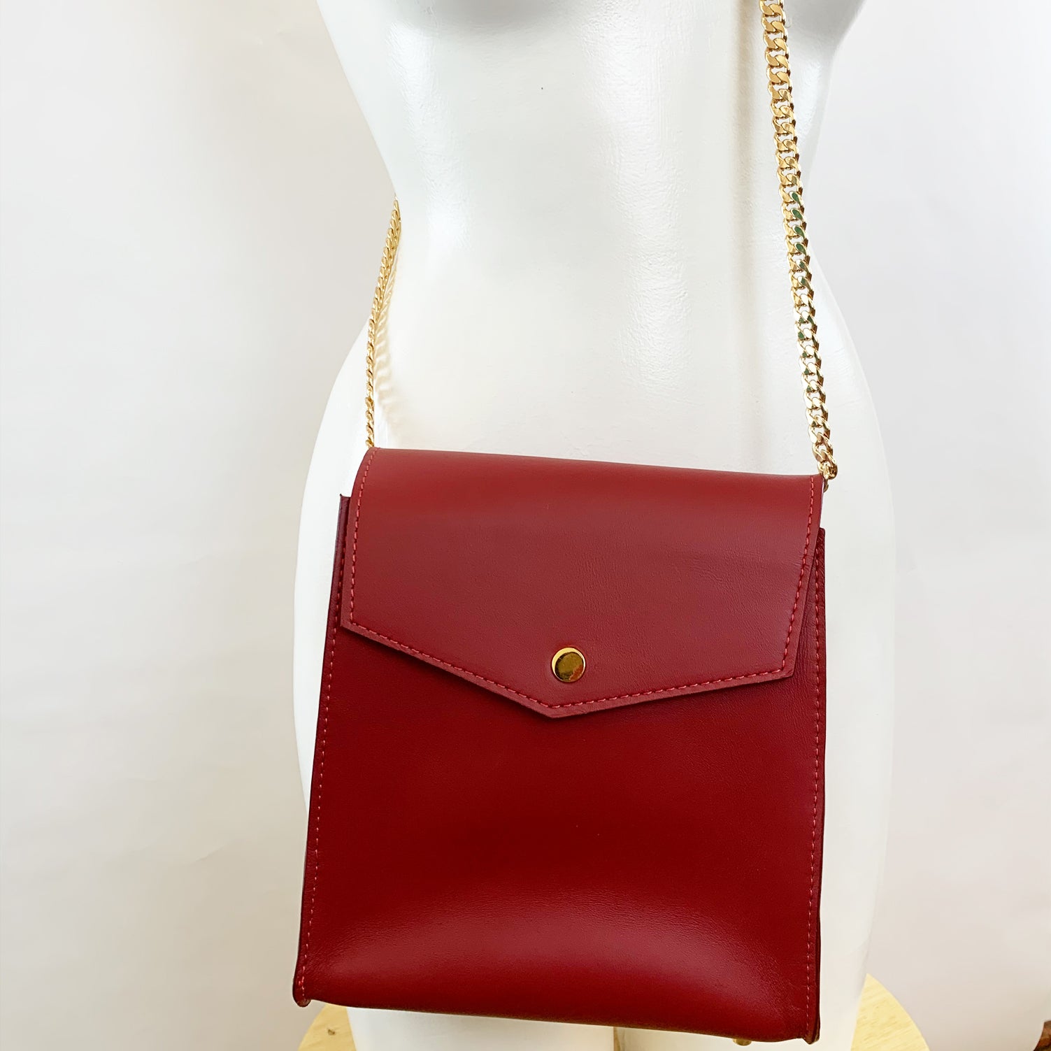 This crossbody bag is handcrafted from beautiful vegetable tanned leather. Includes small pocket. Removable chain straps allows it to be worn on the shoulder or crossbody.