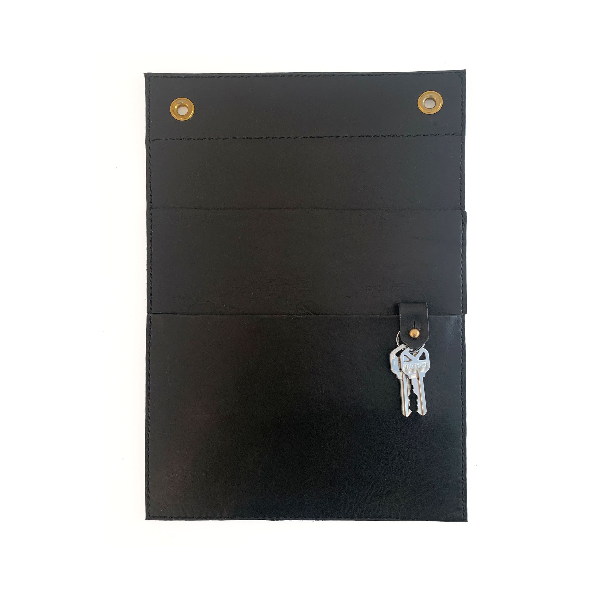 Perfect by the desk or at you enty landing pad, the Ezra wall pocket has two pockets which hold 8.5" x 11" papers as well as a button stud key clip. Made from Horween cowhide.